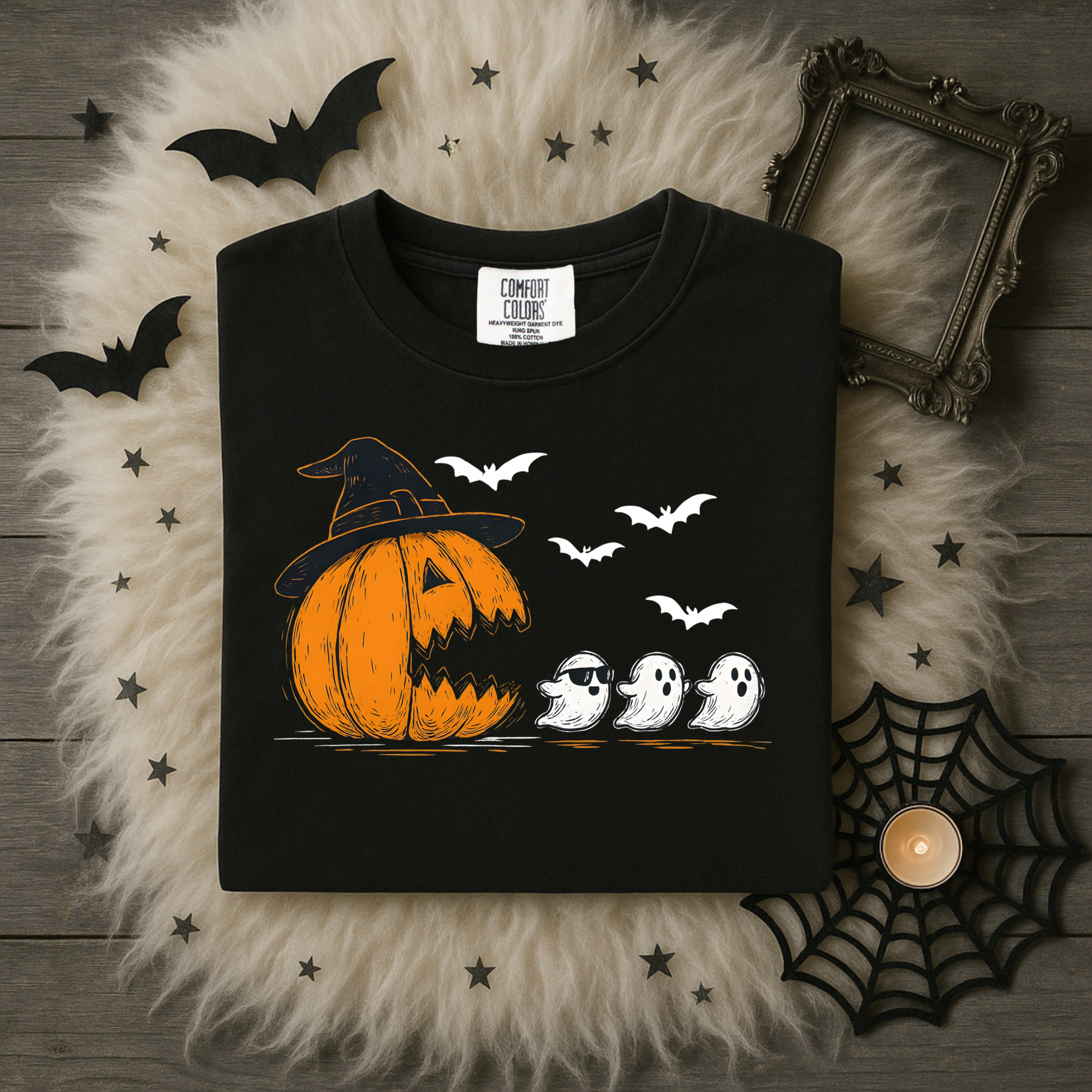 This Pumpkin Chasing Ghost T-shirt combines comfort and style with its 100% cotton fabric and unisex fit, ensuring a soft, breathable feel and a flattering silhouette for all. Perfect for casual wear, its durable material and classic design make it an ideal choice for everyday comfort with a seasonal twist.